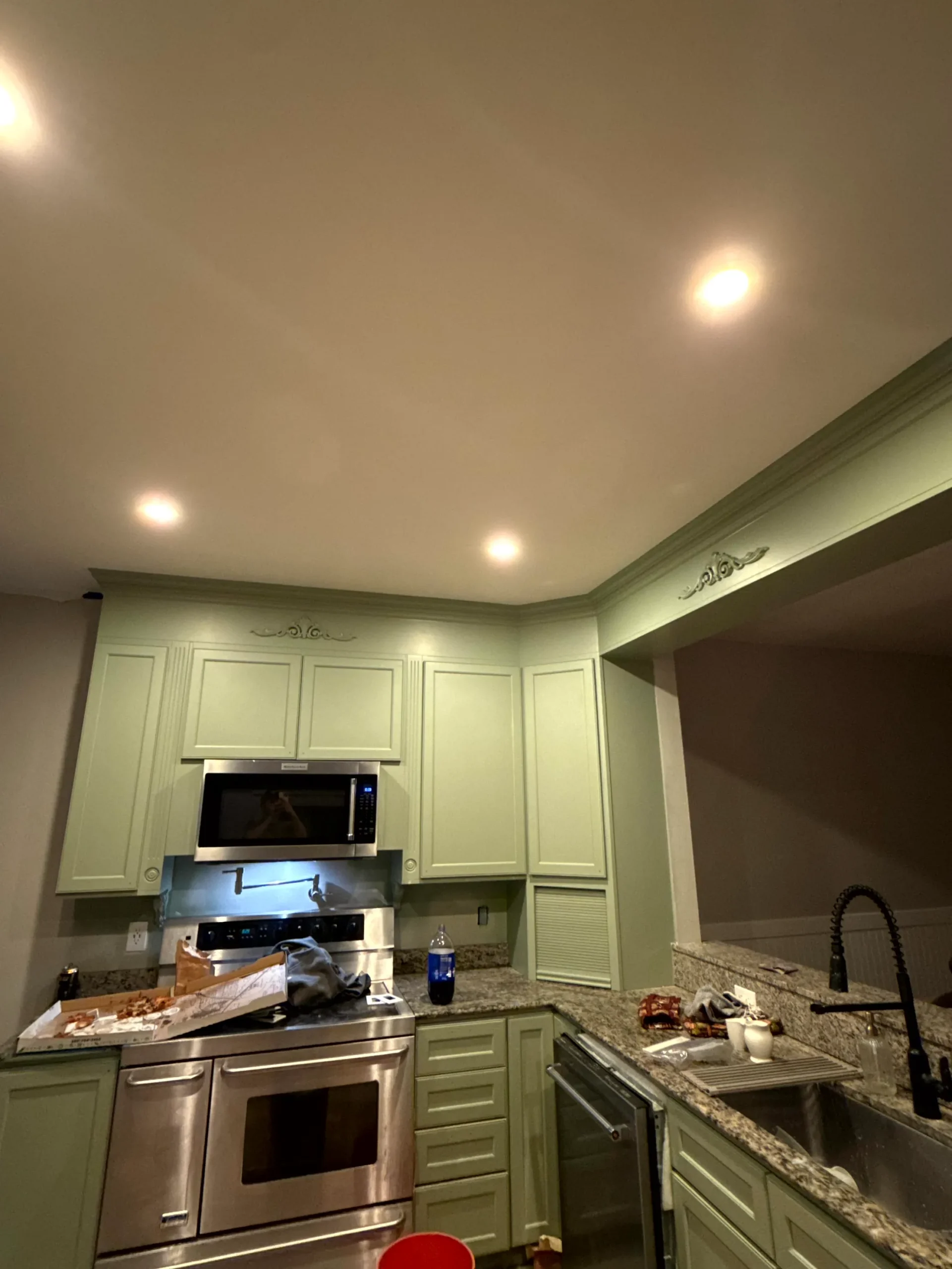 We protect the surrounding area, prep all surfaces, apply the correct primer, spray the topcoat for a smooth factory finish, reinstall, and clean before walking you through the result. That sequence is non-negotiable on every cabinet project we take on.